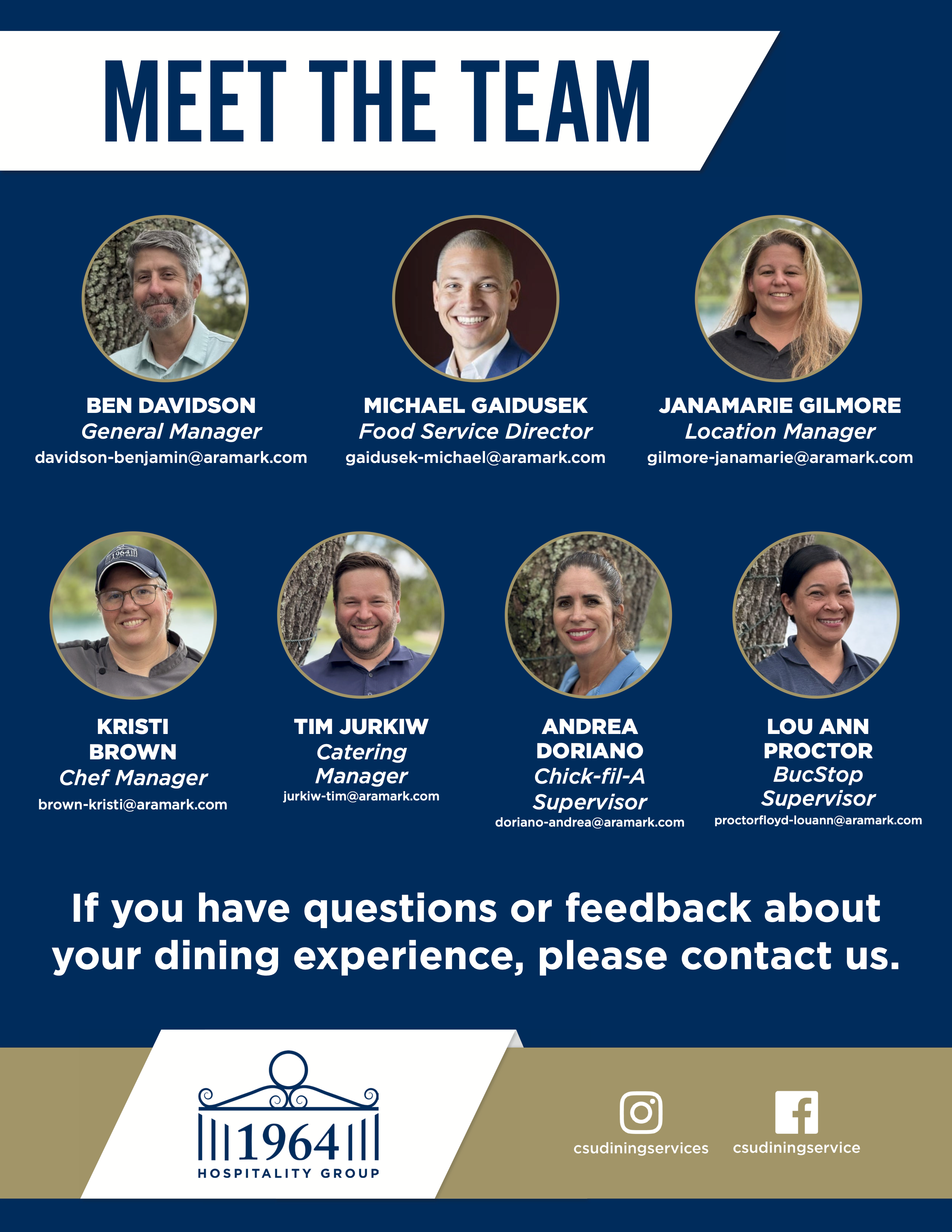 We are here to serve you and make your experience on campus one to remember. Please do not hesitate to reach out in person or via phone or email listed below with any questions, comments or feedback.